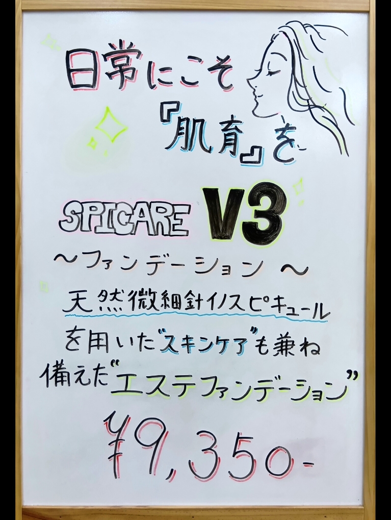 乾燥するこの季節こそ普段使用するファンデーションで保湿美容を! SPICARE V3ファンデーションは 天然の微細針イノスピキュールを用いたスキンケアも兼ね備えるエステファンデーション!(^^)/ お肌のコンディションを整える為に、厳選された保湿成分を配合☆ 独自の技術に...